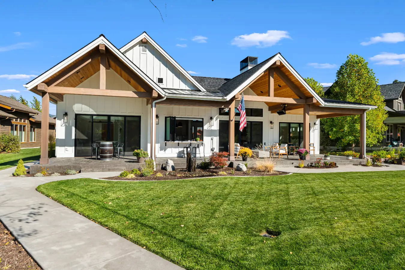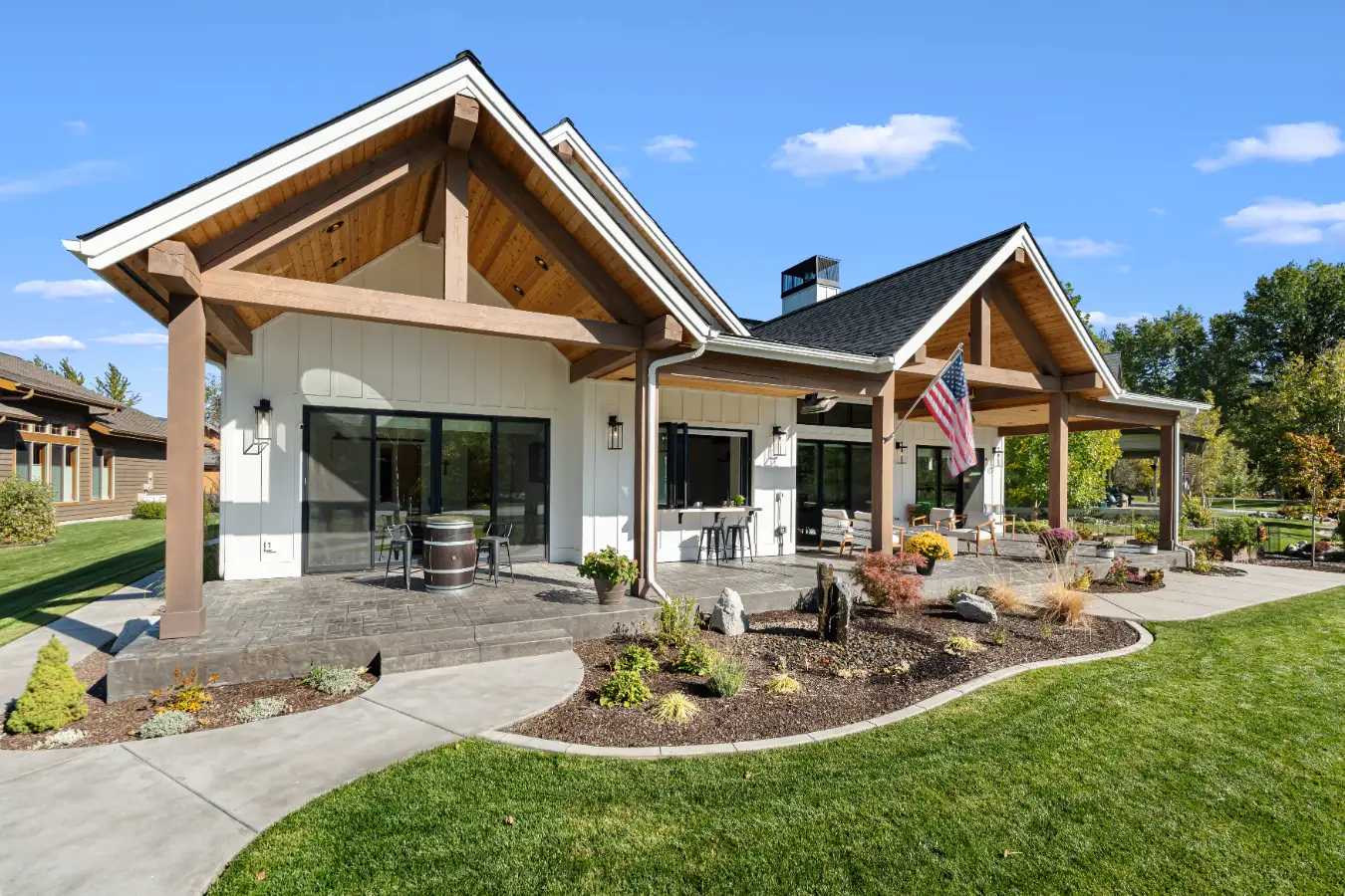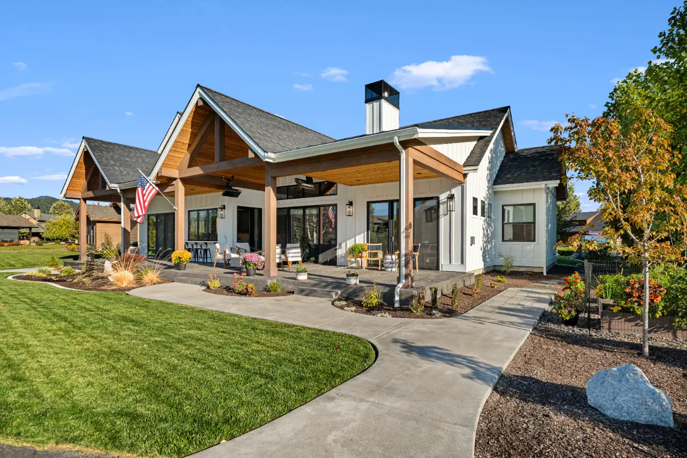 The exterior features warm natural wood accents, crisp siding, and expansive windows that frame views of Lake Pend Oreille and the surrounding mountains. Wide covered porches and outdoor living spaces encourage gatherings across generations, offering places to relax, dine, and connect in every season.